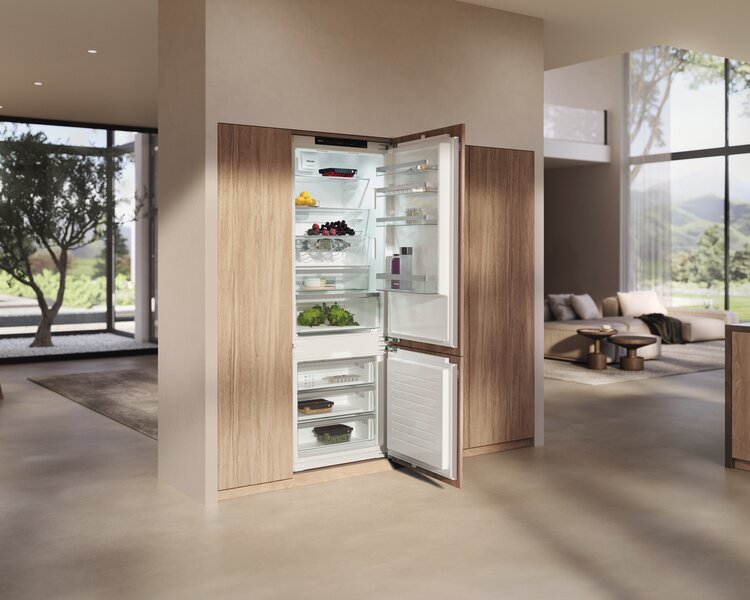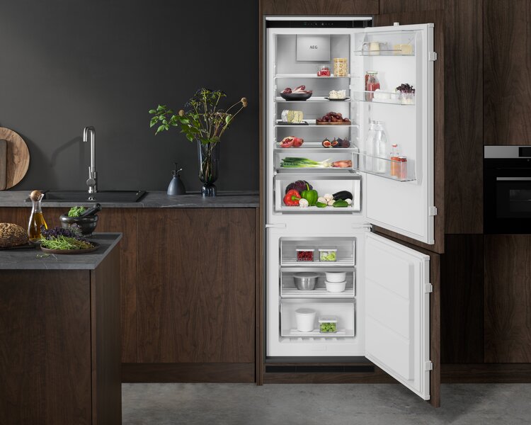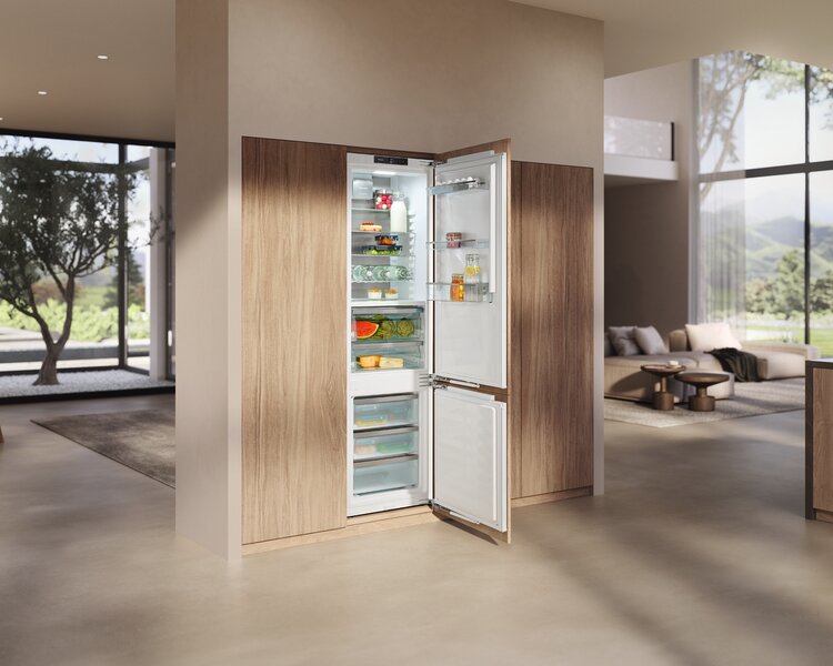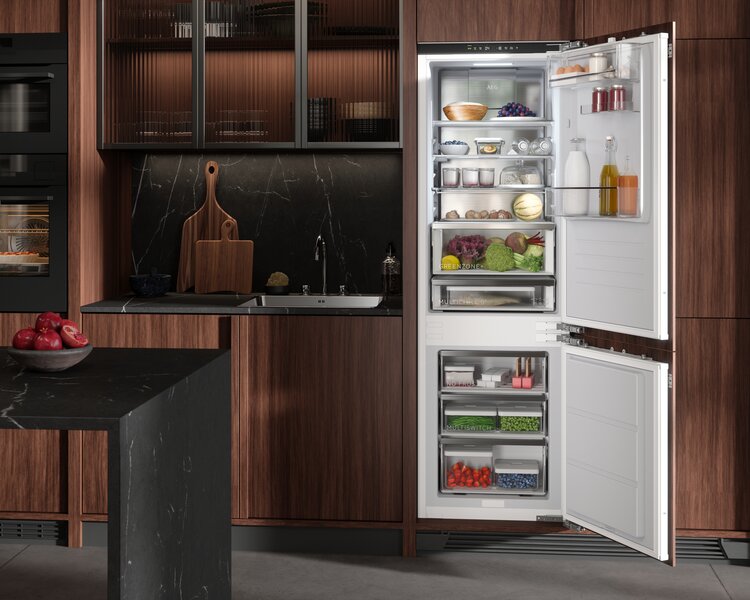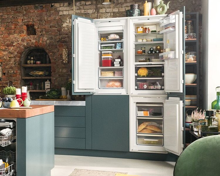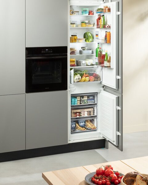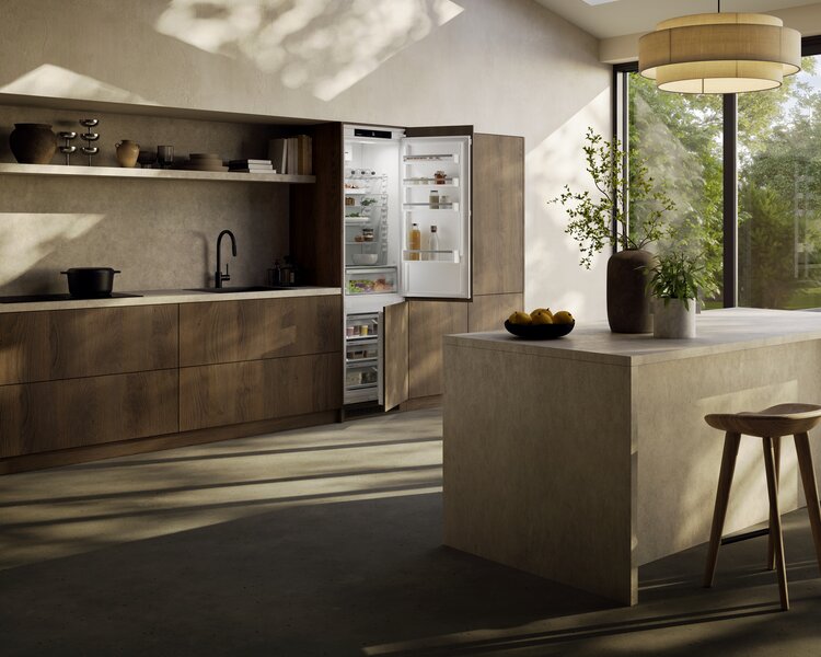 Einbau-Kühl-Gefrierkombinationen verschwinden elegant in der Küchenzeile. Hinter einer Möbelfront versteckt integrieren sie sich nahtlos ins Gesamtbild. Der Kühlbereich befindet sich meist oben, das Gefrierfach unten. Für kleine bis mittlere Haushalte sind sie oft die beste Wahl, da sie das Kühl- und Gefriervolumen in einem kompakten Format vereinen und sich einfach planen lassen.