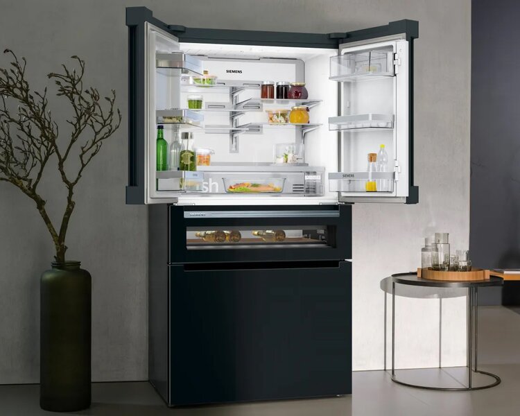 Freistehende Modelle hingegen nutzen ihren Charakter bewusst aus. Sie stehen sichtbar im Raum, spielen mit Edelstahl, Schwarzglas oder markanten Formen und werden heute zunehmend als Designelement eingesetzt. Besonders große Geräte wie French Door, Multi Door oder Side-by-Side geben einer modernen Wohnküche Präsenz und unterstreichen ihren großzügigen Charakter. Allerdings sollte man bedenken, dass besonders breite Modelle eine entsprechende Stellfläche benötigen – nicht nur für ihre Tiefe, sondern auch für ausreichend Türöffnungswinkel.